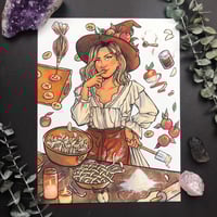 This item is a color print of an original piece I created for my Witchtober challenge in 2020 featuring a witch mixing her divination with her love of baking.