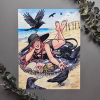 This item is a color print of an original piece I created for my Witchtober challenge in 2021 featuring a witch lounging on the beach with her crow familiars!