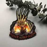 A vinyl sticker with the words “never sleep again” with a freddy glove emerging from a burning furnace.